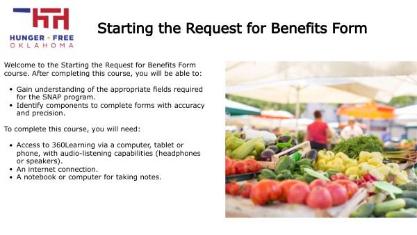 Welcome to the Starting the Request for Benefits Form course. After completing this course, you will be able to:- Access to 360Learning via a computer, tablet or phone, with audio-listening capabilities (headphones or speakers).