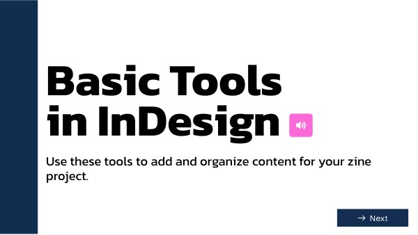 Learn and identify the names and functions of basic InDesign tools that can be used to create and customize your zine.