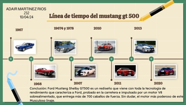 En 1967, Carroll Shelby creó Ford Mustang GT350, el primero de una espectacular lista de autos. Tenía un V8 modificado de 7L y 428 pulgadas cúbicas de poder, que estaba inspirado en el 1,2,3 de su equipo en Le Mans. Este mismo año (1967) también se presentó el GT500 con un motor “Cobra Le Mans” Ford V8.