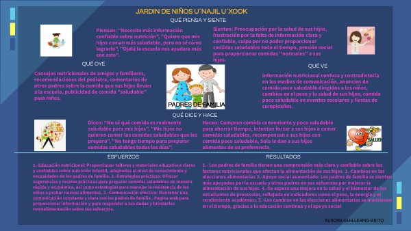 1.-Educación nutricional: Proporcionar talleres y materiales educativos claros y confiables sobre nutrición infantil, adaptados al nivel de conocimiento y necesidades de los padres de familia. 2.-Estrategias prácticas: Ofrecer sugerencias y recetas prácticas para preparar comidas saludables de manera rápida y económica, así como estrategias para manejar la resistencia de los niños a probar nuevos alimentos. 3.-Comunicación efectiva: Mantener una comunicación constante y clara con los padres de familia , Pagina web para proporcionar información y para responder a sus dudas y brindarles retroalimentación sobre sus esfuerzos.