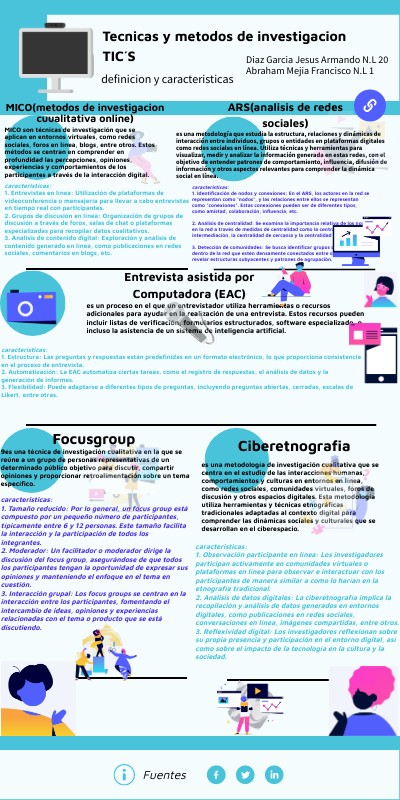 caracteristicas: 1. Entrevistas en línea: Utilización de plataformas de videoconferencia o mensajería para llevar a cabo entrevistas en tiempo real con participantes. 2. Grupos de discusión en línea: Organización de grupos de discusión a través de foros, salas de chat o plataformas especializadas para recopilar datos cualitativos. 3. Análisis de contenido digital: Exploración y análisis de contenido generado en línea, como publicaciones en redes sociales, comentarios en blogs, etc.