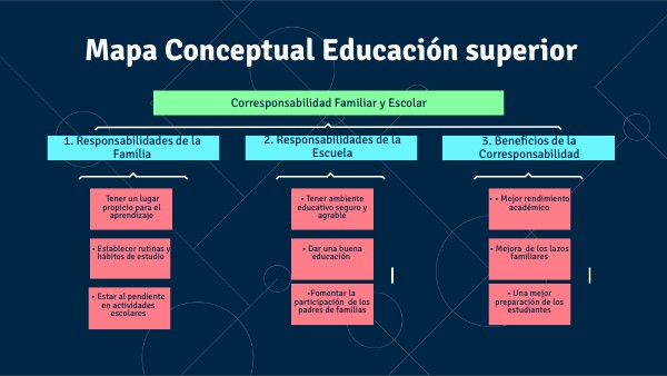 Este mapa mental presenta visualmente la relación entre la familia y la escuela en la corresponsabilidad educativa, con sus respectivas responsabilidades y los beneficios que aporta esta colaboración.