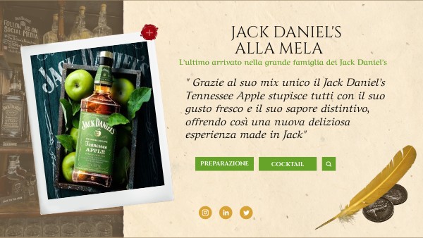 " Grazie al suo mix unico il Jack Daniel’s Tennessee Apple stupisce tutti con il suo gusto fresco e il suo sapore distintivo, offrendo così una nuova deliziosa esperienza made in Jack"