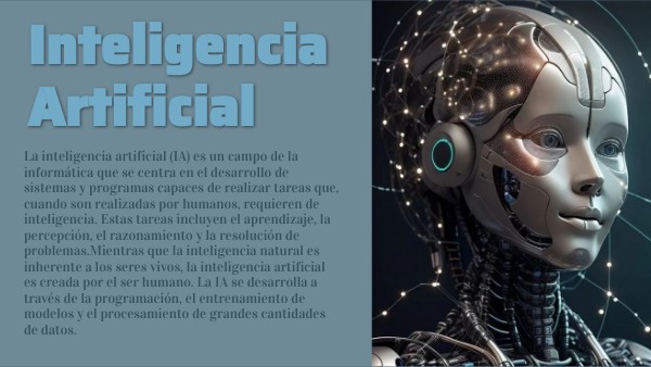 La inteligencia artificial (IA) es un campo de la informática que se centra en el desarrollo de sistemas y programas capaces de realizar tareas que, cuando son realizadas por humanos, requieren de inteligencia. Estas tareas incluyen el aprendizaje, la percepción, el razonamiento y la resolución de problemas.Mientras que la inteligencia natural es inherente a los seres vivos, la inteligencia artificial es creada por el ser humano. La IA se desarrolla a través de la programación, el entrenamiento de modelos y el procesamiento de grandes cantidades de datos.