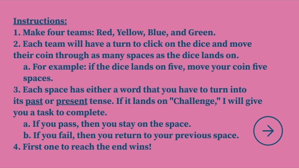 Instructions: 1. Make four teams: Red, Yellow, Blue, and Green. 2. Each team will have a turn to click on the dice and move their coin through as many spaces as the dice lands on. a. For example: if the dice lands on five, move your coin five spaces.3. Each space has either a word that you have to turn into its past or present tense. If it lands on "Challenge," I will give you a task to complete. a. If you pass, then you stay on the space. b. If you fail, then you return to your previous space.4. First one to reach the end wins!
