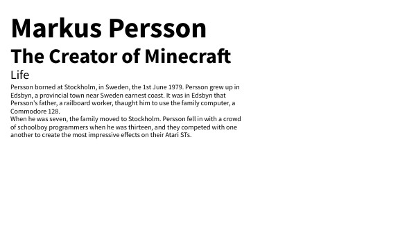 Computer magazines of the day would print strings of code on their back pages, which could be transcribed by the reader to create playable games. Persson borned at Stockholm, in Sweden, the 1st June 1979. By 1994, Persson knew he wanted to make games for a living, but his teachers advised him to study graphic design, which led to his first job, as a Web-designer. After two years, Persson landed a job at a Web-game company, where he worked as a programmer and designer on for no fewer than thirty Flash games. In his spare time, he continued to work on his own projects, entering competitions to make games with thight memory contraints in order to focus his creativity.