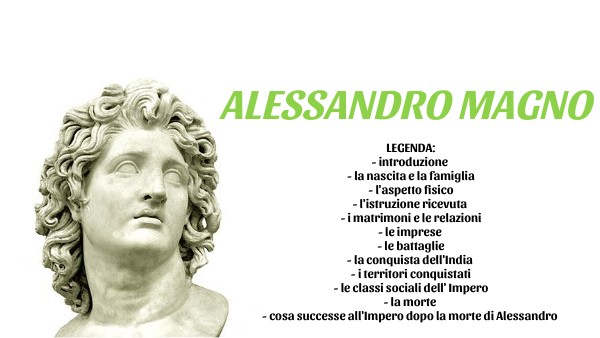 LEGENDA:- introduzione - la nascita e la famiglia - l'aspetto fisico - l'istruzione ricevuta - i matrimoni e le relazioni - le imprese - le battaglie - la conquista dell'India - i territori conquistati - le classi sociali dell' Impero - la morte - cosa successe all'Impero dopo la morte di Alessandro