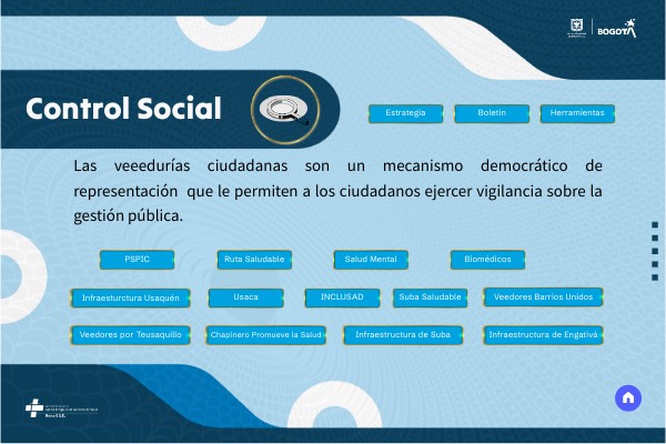 Hacer vigilancia y control social sobre la inversión que realice el Fondo de Desarrollo Local de Suba a los conceptos de gasto en salud como Otorgamiento de Dispositivos de Asistencia Personal, Acciones Complementarias para personas con Discapacidad y sus Cuidadores, Acciones de Cuidado y Protección para Madres Gestantes, Niños y Niñas Migrantes, Reconocimiento de los Saberes Ancestrales en Medicina, Co-Inversión en la Estrategía Territorial de Salud, Prevención del Embarazo en adolescentes y Acciones para la Disminución de Factores de Riesgo Frente al Consumo de Sustancias Psicoactivas en la localidad de Suba (urbana y rural).