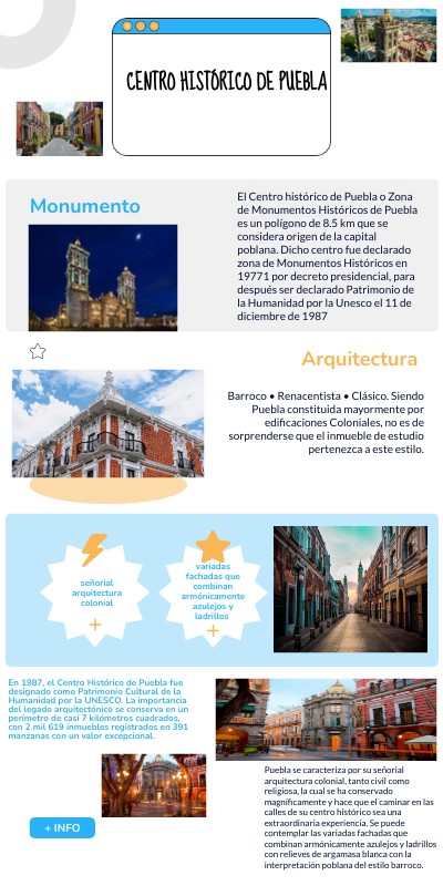 En 1987, el Centro Histórico de Puebla fue designado como Patrimonio Cultural de la Humanidad por la UNESCO. La importancia del legado arquitectónico se conserva en un perímetro de casi 7 kilómetros cuadrados, con 2 mil 619 inmuebles registrados en 391 manzanas con un valor excepcional.