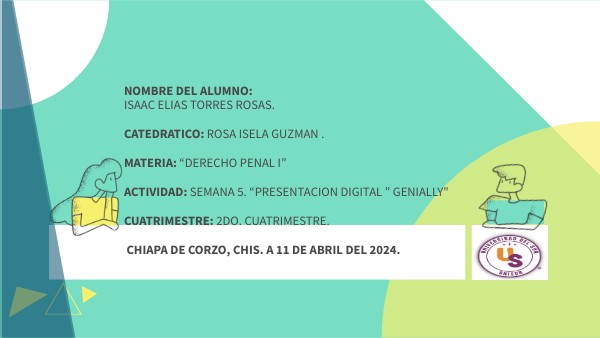 NOMBRE DEL ALUMNO: ISAAC ELIAS TORRES ROSAS. CATEDRATICO: Rosa ISELA GUZMAN . MATERIA: “DERECHO PENAL I” ACTIVIDAD: SEMANA 5. “PRESENTACION DIGITAL ” GENIALLY" CUATRIMESTRE: 2DO. CUATRIMESTRE. CHIAPA DE CORZO, CHIS. A 11 DE ABRIL DEL 2024.