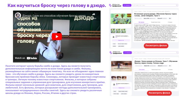 Посетите интернет школу борьбы самбо и дзюдо. Здесь вы можете получить дополнительную информацию почти по всем темам дзюдо и самбо. Фильмы, размещённые на сайте имеют обширную тематику. Но всех их объединяет одна главная тема - это обучение самбо и дзюдо. Здесь вы сможете увидеть уроки по конкретным броскам или приёмам борьбы лёжа. Семинары, которые проводят известные спортсмены и тренеры. Личную технику известных спортсменов. Фильмы, в которых собраны специальные задания и упражнения для тренировки, для изучения конкретного приёма. Фильмы имеют несколько уровней: для новичков, для спортсменов, для тренеров, для любителей. Есть фильмы, которые раскрывают методы дополнительной тренировки, показывают нетрадиционные способы занятий. Здесь вы сможете увидеть различные школы дзюдо из Японии, Кореи, России, Италии и других стран.