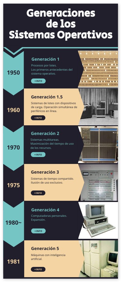 Aparición de computadoras orientadas a oficina de la mano de IBM, posteriormente, con el SO MS-DOS incorporado en el hardware de todas ellas, lo cual supuso una expansión en el uso de este sistema a gran nivel.El SO empezó a contar con abstracciones como el sistema de archivos y, posteriormente, la GUI basada en ventanas e íconos que conocemos. Obtenido de: • Wolf, G. y 3 más (2015). Fundamentos de sistemas operativos (Primera edición). México D.F.: Universidad Nacional Autónoma de México, Instituto de Investigaciones Económicas, Facultad de Ingeniería. • Sistemas Operativos: Concepto y Generaciones.
