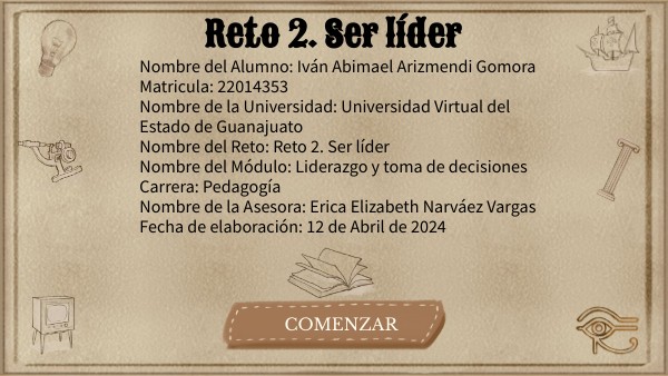 Nombre del Alumno: Iván Abimael Arizmendi Gomora Matricula: 22014353 Nombre de la Universidad: Universidad Virtual del Estado de Guanajuato Nombre del Reto: Reto 2. Ser líder Nombre del Módulo: Liderazgo y toma de decisiones Carrera: Pedagogía Nombre de la Asesora: Erica Elizabeth Narváez Vargas Fecha de elaboración: 12 de Abril de 2024