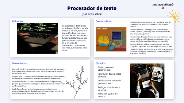 Microsoft Word: Es uno de los procesadores de textos más populares y ampliamente utilizados, que forma parte del paquete de software de Microsoft Office. Google Docs: Es una aplicación basada en la nube que permite crear y editar documentos de texto de forma colaborativa en tiempo real. LibreOffice Writer: Es un procesador de textos de código abierto y gratuito que ofrece una amplia gama de características similares a las de Microsoft Word. Apple Pages: Es una aplicación de procesamiento de textos desarrollada por Apple, diseñada específicamente para usuarios de dispositivos Apple como Mac, iPad y iPhone.