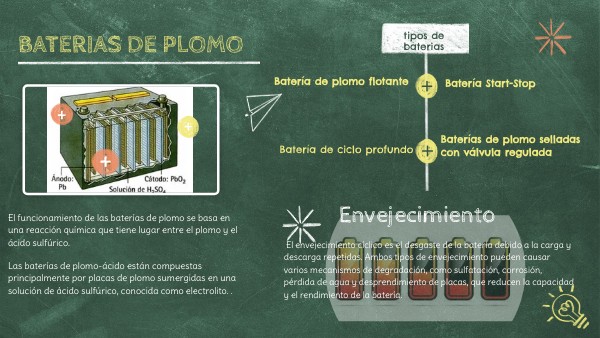 El funcionamiento de las baterías de plomo se basa en una reacción química que tiene lugar entre el plomo y el ácido sulfúrico.Las baterías de plomo-ácido están compuestas principalmente por placas de plomo sumergidas en una solución de ácido sulfúrico, conocida como electrolito. .