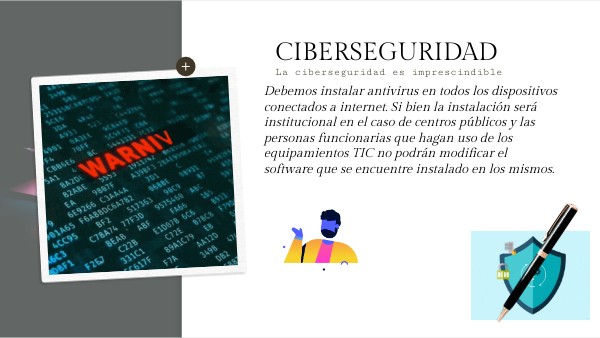 Debemos instalar antivirus en todos los dispositivos conectados a internet. Si bien la instalación será institucional en el caso de centros públicos y las personas funcionarias que hagan uso de los equipamientos TIC no podrán modificar el software que se encuentre instalado en los mismos.