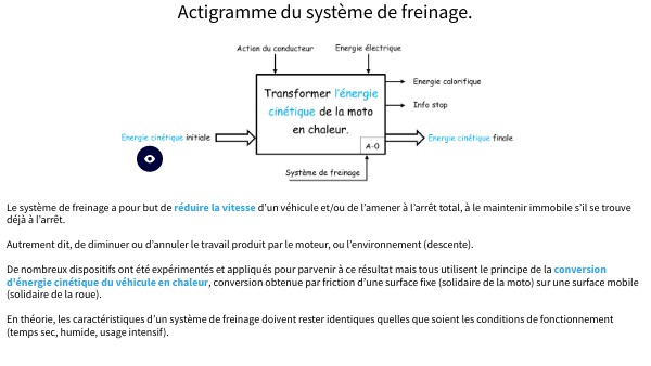 Le système de freinage a pour but de réduire la vitesse d’un véhicule et/ou de l’amener à l’arrêt total, à le maintenir immobile s’il se trouve déjà à l’arrêt. Autrement dit, de diminuer ou d’annuler le travail produit par le moteur, ou l’environnement (descente). De nombreux dispositifs ont été expérimentés et appliqués pour parvenir à ce résultat mais tous utilisent le principe de la conversion d'énergie cinétique du véhicule en chaleur, conversion obtenue par friction d’une surface fixe (solidaire de la moto) sur une surface mobile (solidaire de la roue). En théorie, les caractéristiques d’un système de freinage doivent rester identiques quelles que soient les conditions de fonctionnement (temps sec, humide, usage intensif).