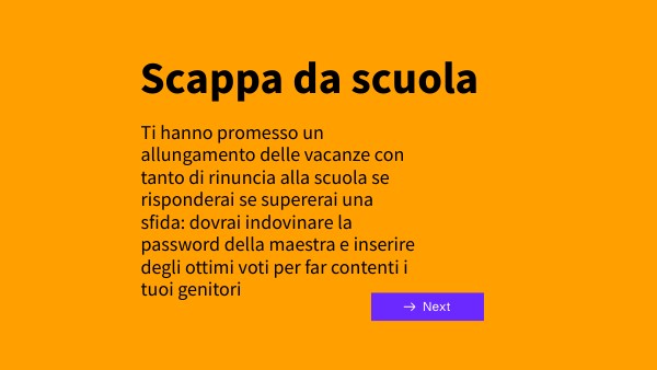 Ti hanno promesso un allungamento delle vacanze con tanto di rinuncia alla scuola se risponderai se supererai una sfida: dovrai indovinare la password della maestra e inserire degli ottimi voti per far contenti i tuoi genitori