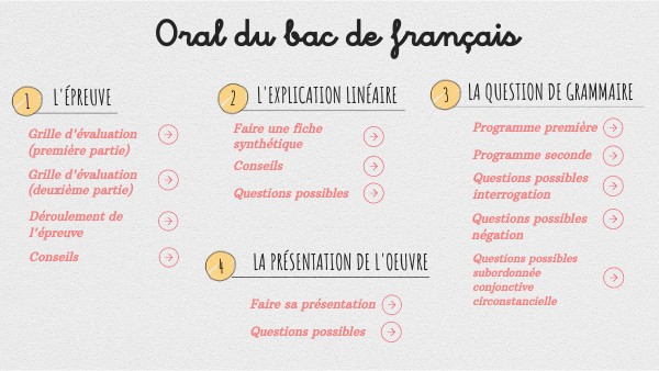 Faire des fiches synthétiques : une fiche pour chaque explication linéaire ; une fiche pour chaque point de grammaire ; une fiche sur l'oeuvre que vous présenterez.