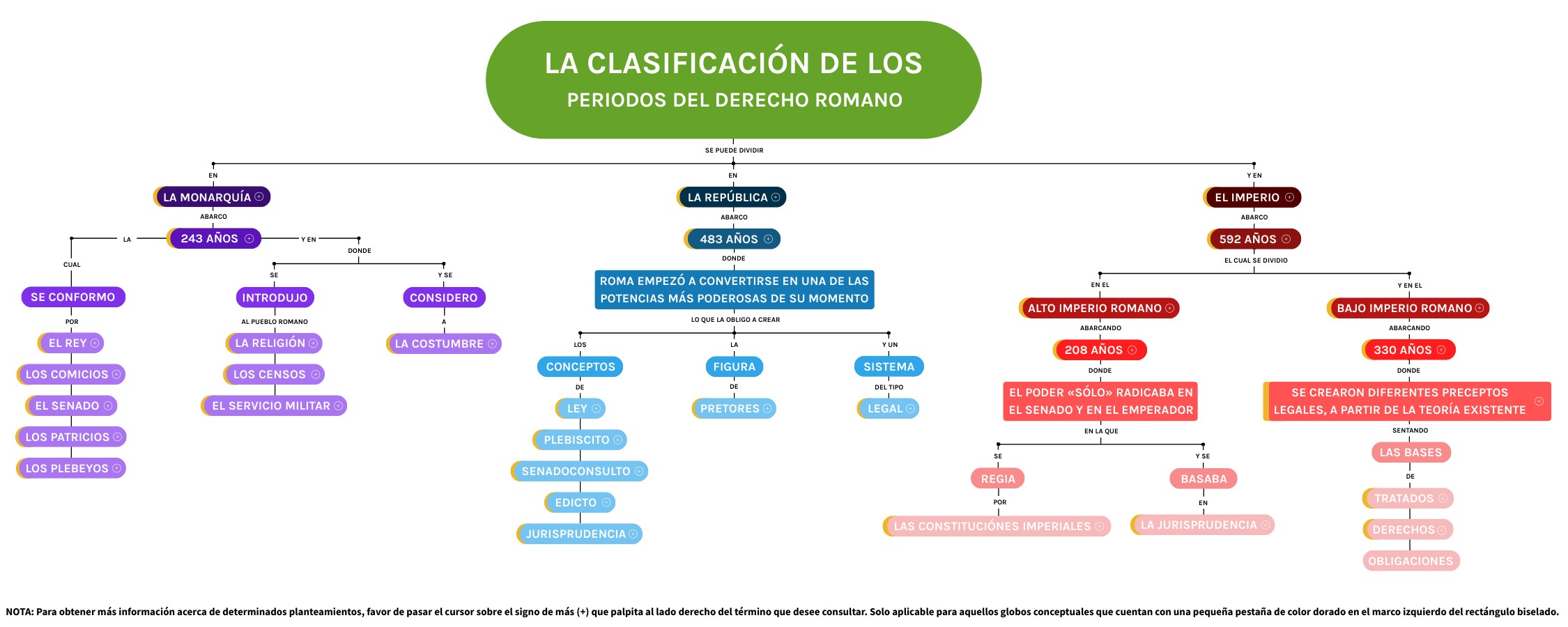 Mapa conceptual donde se trata de señalar algunas de las características más importantes de «cada uno de los periodos del derecho romano» según la interpretación de Eduardo Valentin Rivera a las ideas de Rodríguez Arana (2019) y otros.
