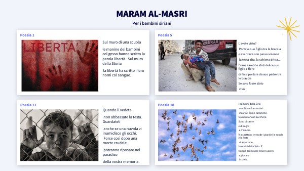I bambini della Siria avvolti nei loro sudari incartati come caramelle. Ma non sono di zucchero. Sono di carne e di sogni e d'amore. Vi aspettano le strade i giardini le scuole e le feste vi aspettano, bambini della Siria. E' troppo presto per essere uccelli e giocare in cielo.