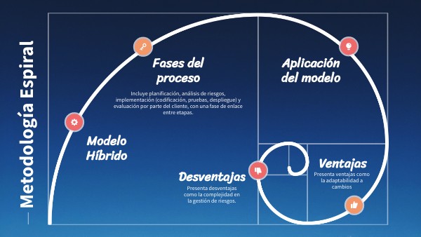 El modelo en Espiral es una combinación del modelo waterfall y un modelo iterativo, pasando por etapas de conceptualización, desarrollo, mejoras y mantenimiento.