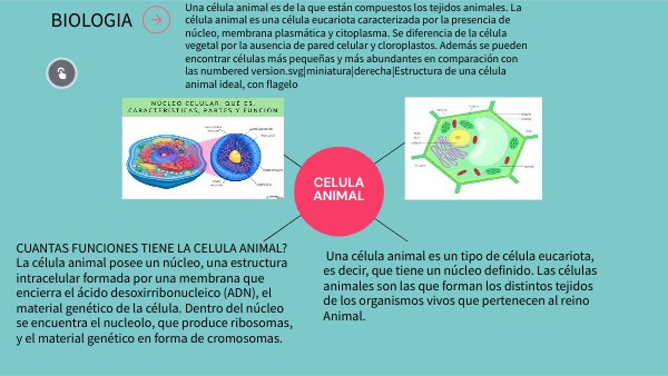 Una célula animal es de la que están compuestos los tejidos animales. La célula animal es una célula eucariota caracterizada por la presencia de núcleo, membrana plasmática y citoplasma. Se diferencia de la célula vegetal por la ausencia de pared celular y cloroplastos. Además se pueden encontrar células más pequeñas y más abundantes en comparación con las numbered version.svg|miniatura|derecha|Estructura de una célula animal ideal, con flagelo