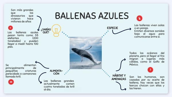 Las ballenas azules pesan tanto como 33 elefantes (200 toneladas) y pueden llegar a medir hasta 100 pies.