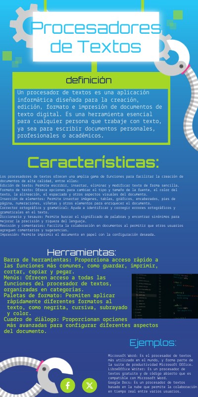 Microsoft Word: Es el procesador de textos más utilizado en el mundo, y forma parte de la suite de productividad Microsoft Office. LibreOffice Writer: Es un procesador de textos gratuito y de código abierto que es compatible con Microsoft Word. Google Docs: Es un procesador de textos basado en la nube que permite la colaboración en tiempo real entre varios usuarios.