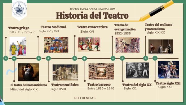 Autores y obras del realismo y el naturalismo. (s. f.). Viajando entre letras. https://viajando-entre-letras.site123.me/realismo-y-naturalismo/autores-y-obras-del-realismo-y-el-naturalismoCastillo, I. (2021, 8 abril). Teatro romántico. Lifeder. https://www.lifeder.com/teatro-romantico/ Travi, C. (2023, 12 diciembre). Teatro medieval (características, tipos y ejemplos). Enciclopedia del Lenguaje. https://lenguaje.com/teatro-medieval/ Teatro del siglo XX: introducción. (2010, 9 marzo). ARTES ESCÉNICAS. https://arteescenicas.wordpress.com/2010/03/09/teatro-del-siglo-xx-introduccion/#:~:text=La%20caracter%C3%ADstica%20principal%20en%20el,los%20aspectos%20t%C3%A9cnicos%20y%20esc%C3%A9nicos.