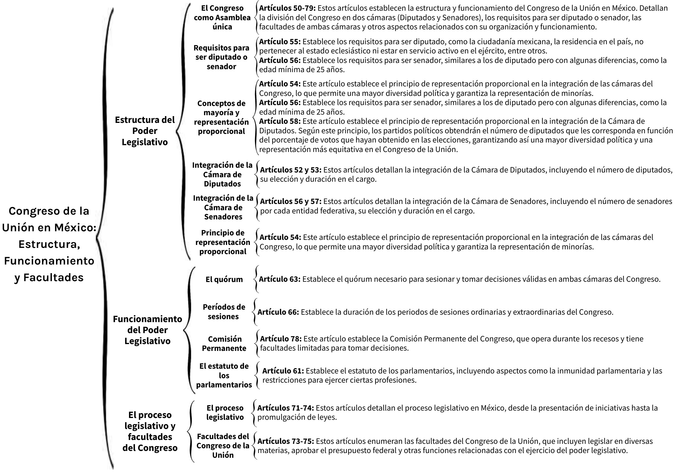 Artículos 73-75: Estos artículos enumeran las facultades del Congreso de la Unión, que incluyen legislar en diversas materias, aprobar el presupuesto federal y otras funciones relacionadas con el ejercicio del poder legislativo.