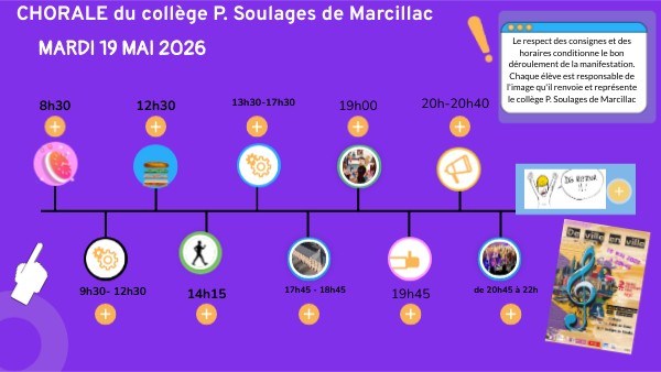 Le respect des consignes et des horaires conditionne le bon déroulement de la manifestation. Chaque élève est responsable de l'image qu'il renvoie et représente le collège P. Soulages de Marcillac