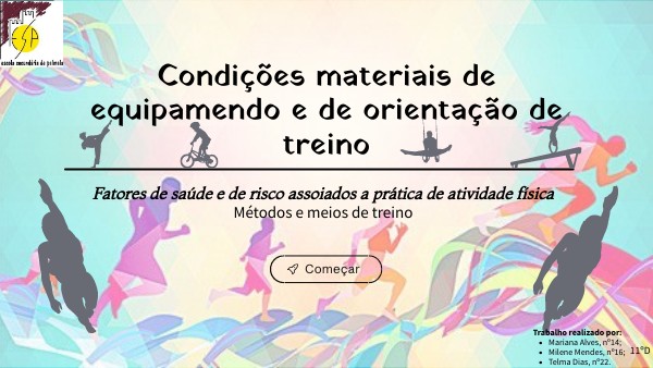 Este trabalho foi realizado no âmbito da disciplina de Educação Física. Sabemos que a prática de atividade física é extremamente importante para a nossa saúde e conduz a um elevado gasto de energia. Caminhadas, natação , musculação e alongamento são algumas atividades físicas e tais podem ser praticadas em variados locais, como ginásio, parques e até mesmo em casa. Mas há algo que nunca reparamos, pois para termos um bom desempenho na prática de exercício físico necessitamos sempre de boas condições materiais , de equipamento e de orientação de treino. São estes temas que iremos abordar neste trabalho, relacionando os mesmos com com os meios e métodos de treino e os fatores de saúde e risco existentes na prática de exercício físico.