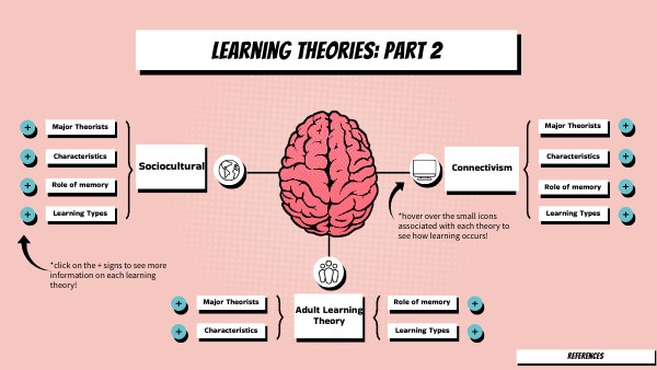 Connectivism accepts that technology is a major part of the learning process and that our constant ability to be connected allows for opportunities to make choices about our learning. It also promotes group collaboration and discussion, allowing for different viewpoints and perspectives when it comes to decision-making, problem-solving, and making sense of information. Connectivism promotes learning that happens outside of an individual, such as through social media, online networks, blogs, or information databases (WGU, 2021).