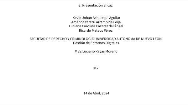 3. Presentación eficaz Kevin Johan Achutegui Aguilar América Yaretzi Arrambide Leija Luciana Carolina Cazarez del Ángel Ricardo Mateos Pérez FACULTAD DE DERECHO Y CRIMINOLOGÍA UNIVERSIDAD AUTÓNOMA DE NUEVO LEÓN Gestión de Entornos Digitales MES.Luciano Rayas Moreno 012 14 de Abril, 2024