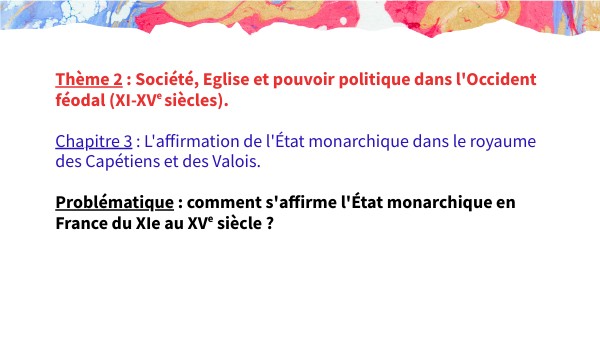 Thème 2 : Société, Eglise et pouvoir politique dans l'Occident féodal (XI-XVe siècles). Chapitre 2 : L'affirmation de l'État monarchique dans le royaume des Capétiens et des Valois. Problématique : comment s'affirme l'État monarchique en France du XIe au XVe siècle ?