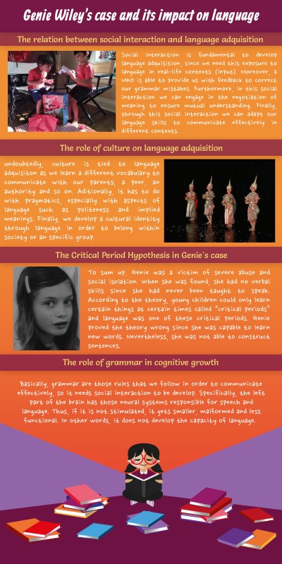 To sum up, Genie was a victim of severe abuse and social isolation. When she was found, she had no verbal skills since she had never been taught to speak. According to the theory, young children could only learn certain things at certain times called “critical periods” and language was one of these critical periods. Genie proved the theory wrong since she was capable to learn new words. Nevertheless, she was not able to construct sentences.