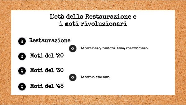 Le grandi potenze unite nel Congresso di Vienna (in particolar modo Austria, Regno Unito, Prussia e Russia) si impegnano a restaurare ("ristabilire") la situazione politica precedente alla rivoluzione francese e alle guerre napoleoniche, seguendo il principio di legittimità (re per diritto divino deve tornare sul legittimo trono) e il principio di equilibrio (di grandi potenze che non potevano prevalere sulle altre). Questo accordo, detto "concerto europeo", assicurò un lungo periodo di pace.Il Congresso non tenne conto dei desideri dei sudditi, causando insurrezioni e rivolte ("i moti"), spesso represse nel sangue. Ebbe così inizio l'eta della restaurazione (1814-1848).
