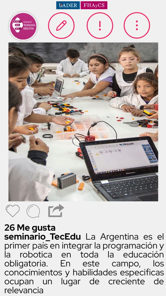 26 Me gustaseminario_TecEdu La Argentina es el primer país en integrar la programación y la robotica en toda la educación obligatoria. En este campo, los conocimientos y habilidades especificas ocupan un lugar de creciente de relevancia