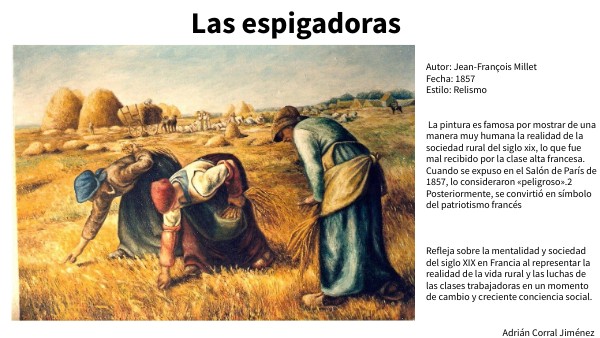 Autor: Jean-François Millet Fecha: 1857 Estilo: Relismo La pintura es famosa por mostrar de una manera muy humana la realidad de la sociedad rural del siglo xix, lo que fue mal recibido por la clase alta francesa. Cuando se expuso en el Salón de París de 1857, lo consideraron «peligroso».2 Posteriormente, se convirtió en símbolo del patriotismo francés Refleja sobre la mentalidad y sociedad del siglo XIX en Francia al representar la realidad de la vida rural y las luchas de las clases trabajadoras en un momento de cambio y creciente conciencia social.