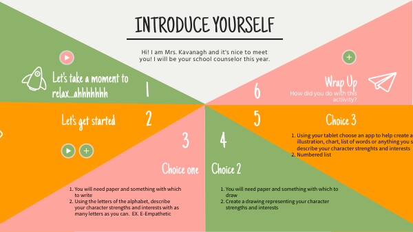 - Using your tablet choose an app to help create an illustration, chart, list of words or anything you see fit to describe your character strenghts and interests