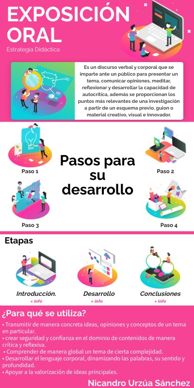 Añadir a la exposición recursos visuales que despierten el interés del público. Es útil que los materiales de apoyo sean visuales, creativos e innovadores y que estén relacionados con las características de la audiencia. Se sugiere que la exposición contenga ejemplos prácticos, los cuales ayudarán a comprender mejor la temática.
