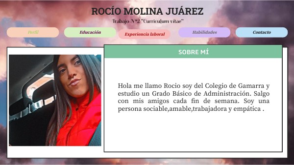 Hola me llamo Rocio soy del Colegio de Gamarra y estudio un Grado Básico de Administración. Salgo con mis amigos cada fin de semana. Soy una persona sociable,amable,trabajadora y empática .