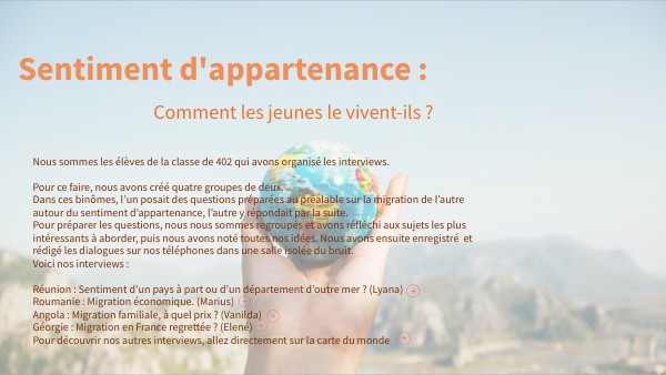 Nous sommes les élèves de la classe de 402 qui avons organisé les interviews. Pour ce faire, nous avons créé quatre groupes de deux. Dans ces binômes, l’un posait des questions préparées au préalable sur la migration de l’autre autour du sentiment d’appartenance, l’autre y répondait par la suite. Pour préparer les questions, nous nous sommes regroupés et avons réfléchi aux sujets les plus intéressants à aborder, puis nous avons noté toutes nos idées. Nous avons ensuite enregistré et rédigé les dialogues sur nos téléphones dans une salle isolée du bruit. Voici nos interviews : Réunion : Sentiment d’un pays à part ou d’un département d’outre mer ? (Lyana) Roumanie : Migration économique. (Marius) Angola : Migration familiale, à quel prix ? (Vanilda) Géorgie : Migration en France regrettée ? (Elené) Pour découvrir nos autres interviews, allez directement sur la carte du monde