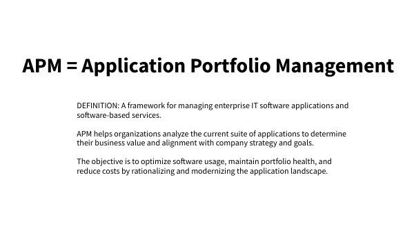 DEFINITION: A framework for managing enterprise IT software applications and software-based services. APM helps organizations analyze the current suite of applications to determine their business value and alignment with company strategy and goals. The objective is to optimize software usage, maintain portfolio health, and reduce costs by rationalizing and modernizing the application landscape.