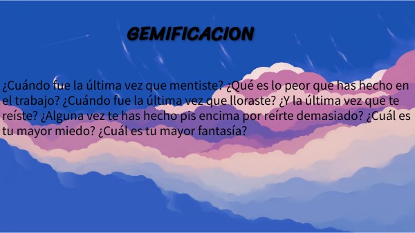 ¿Cuándo fue la última vez que mentiste? ¿Qué es lo peor que has hecho en el trabajo? ¿Cuándo fue la última vez que lloraste? ¿Y la última vez que te reíste? ¿Alguna vez te has hecho pis encima por reírte demasiado? ¿Cuál es tu mayor miedo? ¿Cuál es tu mayor fantasía?