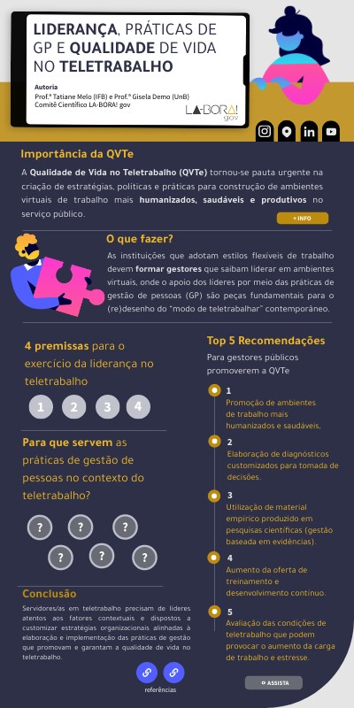 Servidores/as em teletrabalho precisam de líderes atentos aos fatores contextuais e dispostos a customizar estratégias organizacionais alinhadas à elaboração e implementação das práticas de gestão que promovam e garantam a qualidade de vida no teletrabalho.