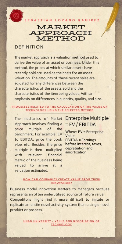 The mechanics of Market Approach involves finding a price multiple of the benchmark. For example: EV to EBITDA, price the book vlue, etc. Besides, the price multiple is then multiplied with relevant financial metric of the business being valued to arrive at a valuation estimated.