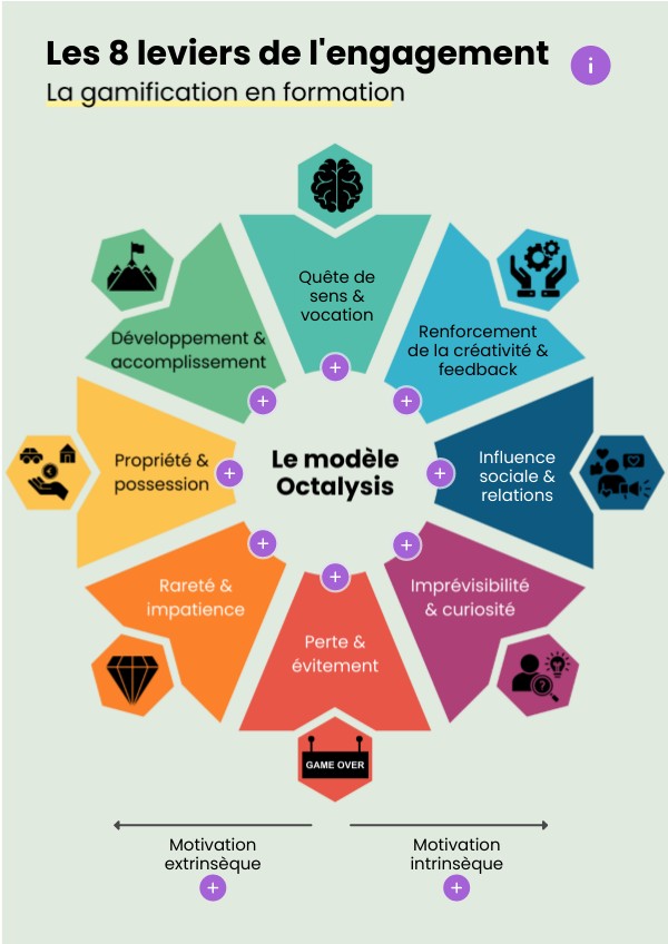 Ce modèle a été imaginé par Yu Kai Chou (2015), spécialiste de la gamification. Le modèle ici présent peut guider et orienter la conception d'une formation gamifiée. Certains leviers peuvent être plus ou moins adaptés en fonction du thème de votre formation mais aussi en fonction de votre public cible.Le secret d'une formation réussie, qui plait au plus grand nombre, est d'inclure de la variété et de donner du rythme grâce aux activités ludiques et interactives.