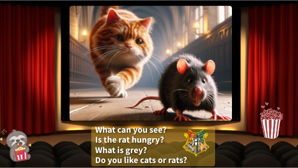 What can you see? Is the rat hungry? What is grey? Do you like cats or rats?